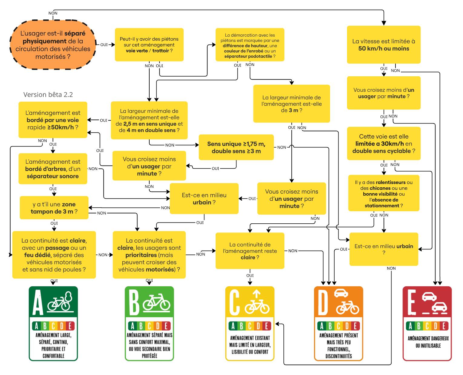 Tous les autres aménagements (bandes cyclables, trottoirs partagés, zones mixtes avec flux motorisés) sont jugés non satisfaisants pour un réseau cyclable à haut niveau de service.